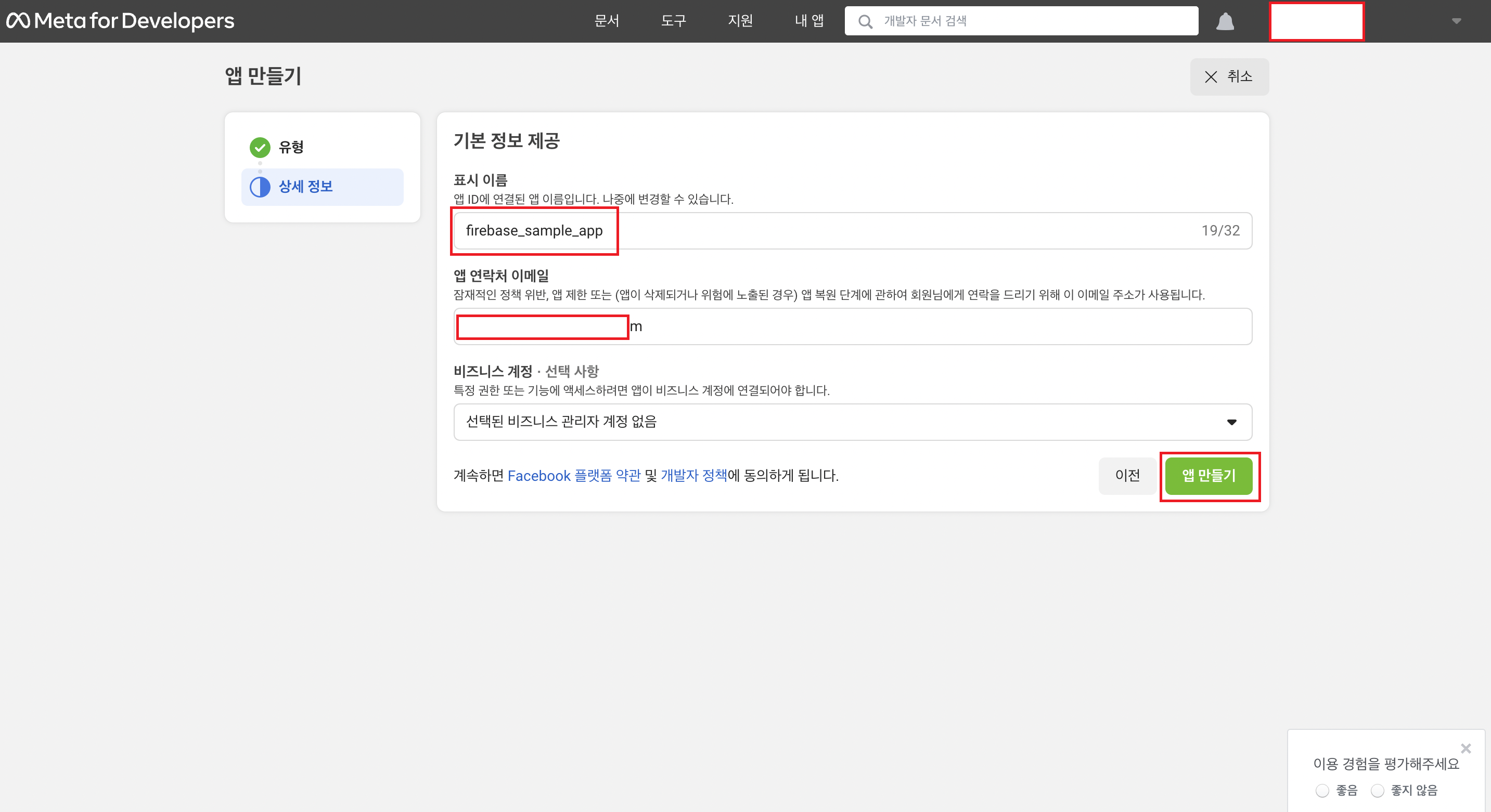- '앱 만들기' 클릭
