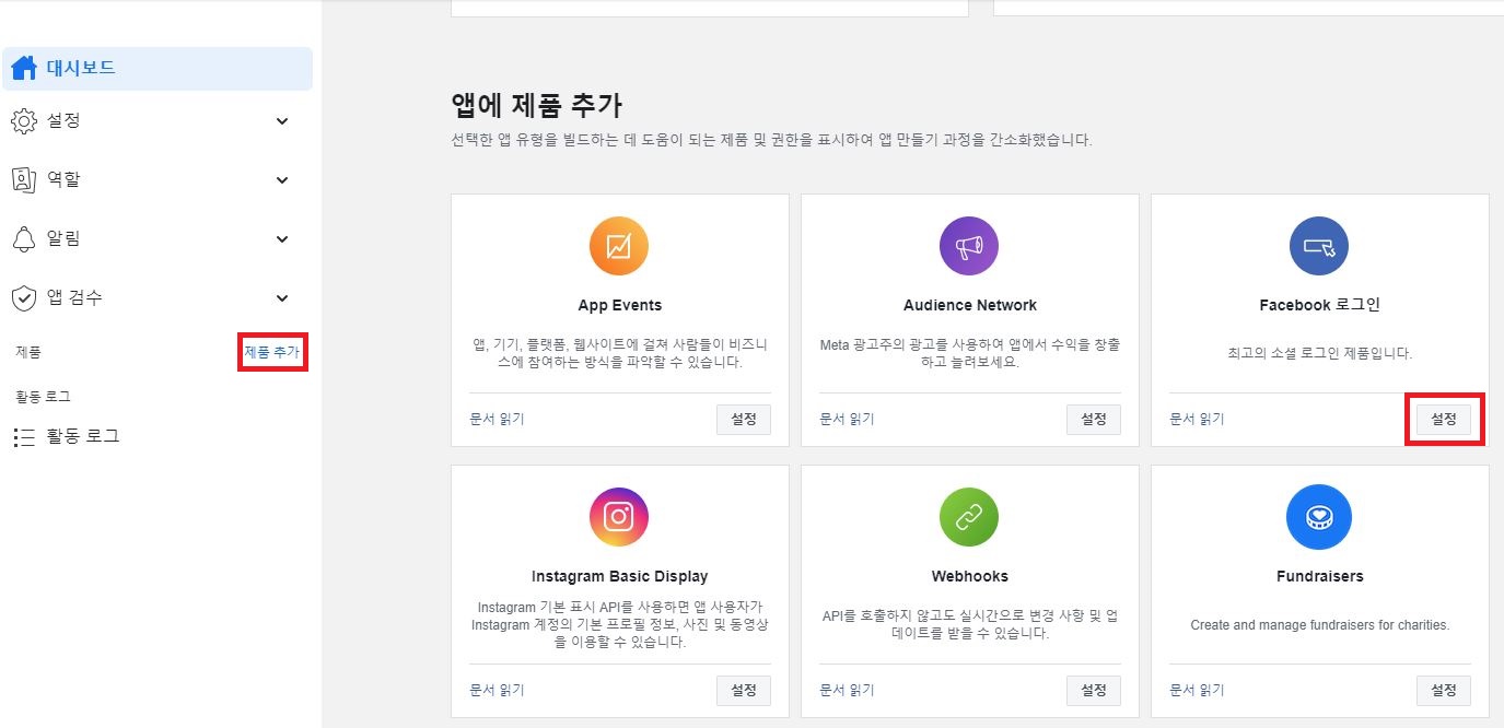 - 대시보드에서 제품추가 >> Facebook 로그인 설정 을 눌러줍니다.