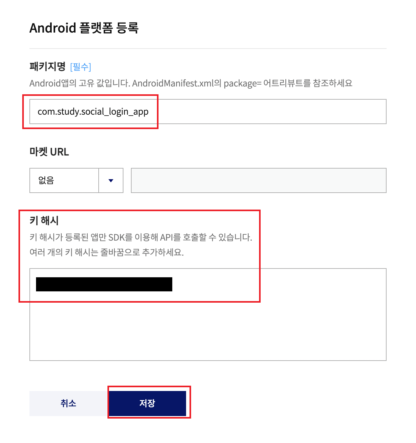 - 패키지명과 키 해시 값을 넣어주세요.