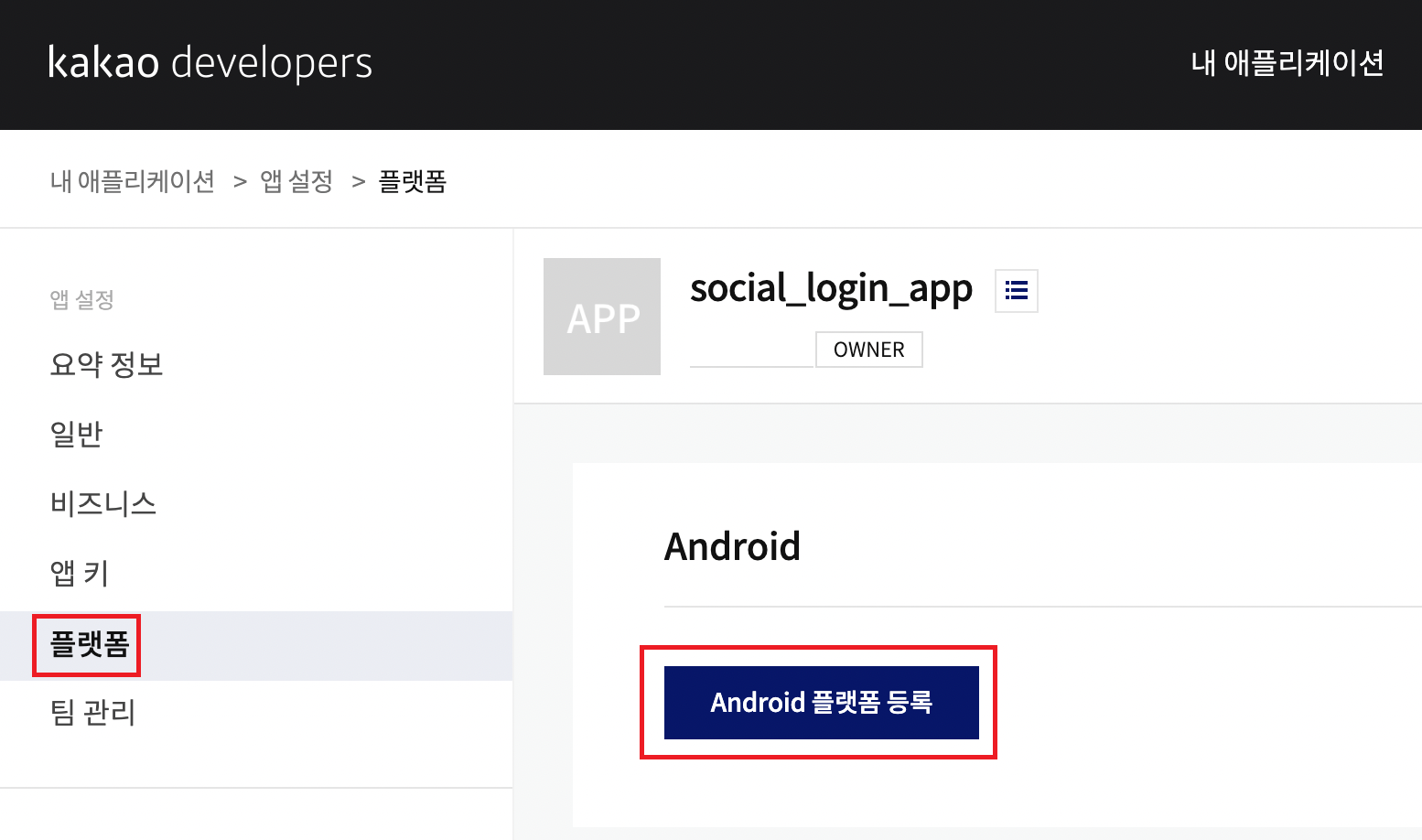 - 플랫폼 >> Android 플랫폼 등록을 눌러주세요.