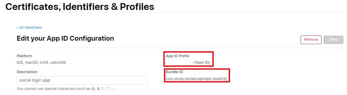 - Identifiers 에서 우측에 Services IDs 를 눌러주면 나오는 IDENTIFIER 값 입니다.
