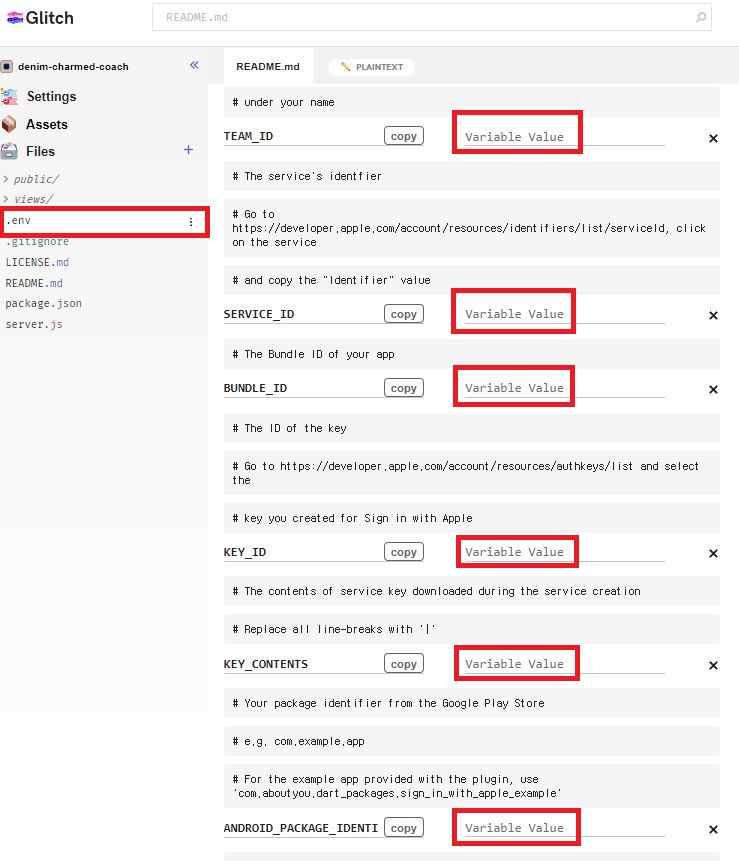 - .env 를 누르고 필요한 TEAM_ID, SERVICE_ID, BUNDLE_ID, KEY_ID, KEY_CONTENTS, ANDROID_PACKAGE_IDENTI 6가지 값을 넣어줍니다.