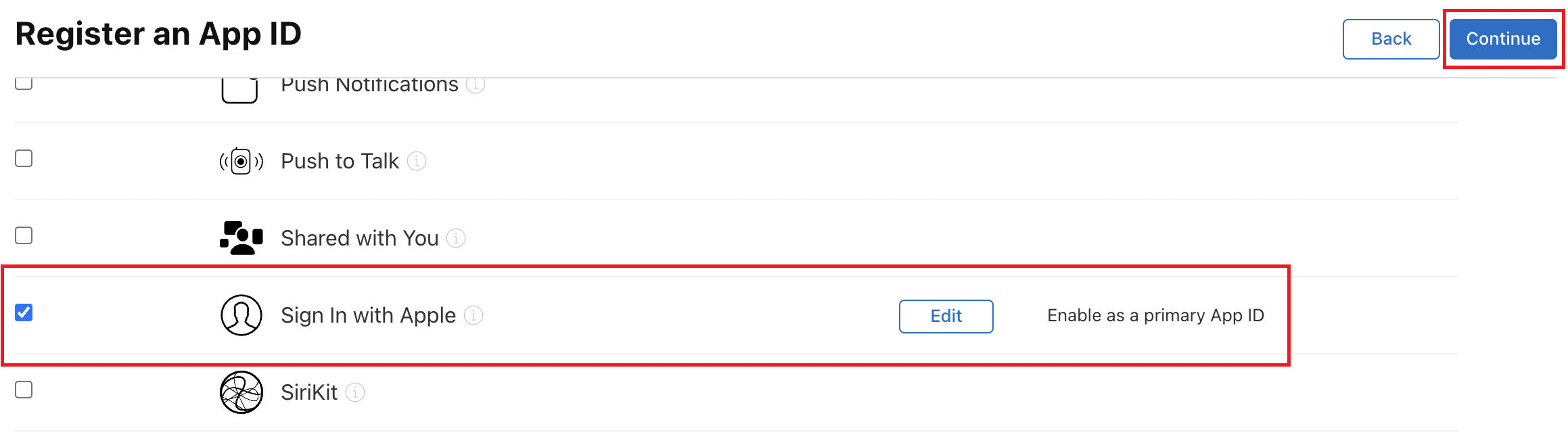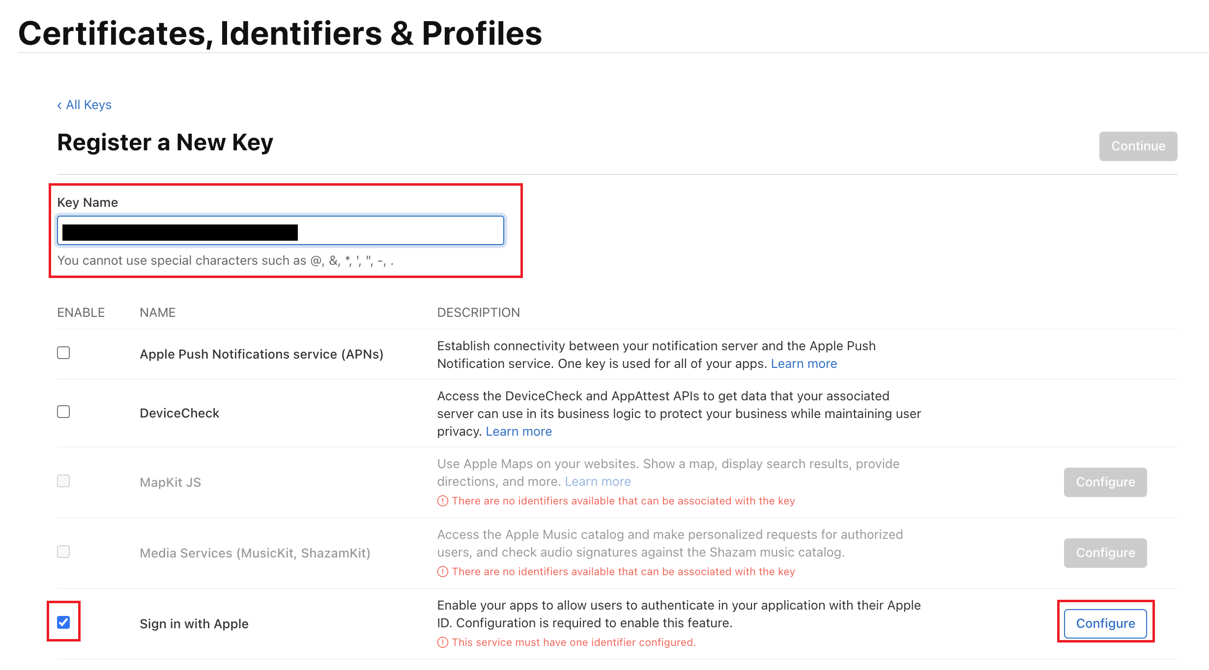- 아래로 내려와서 Sign In with Apple 체크해주고 Continue