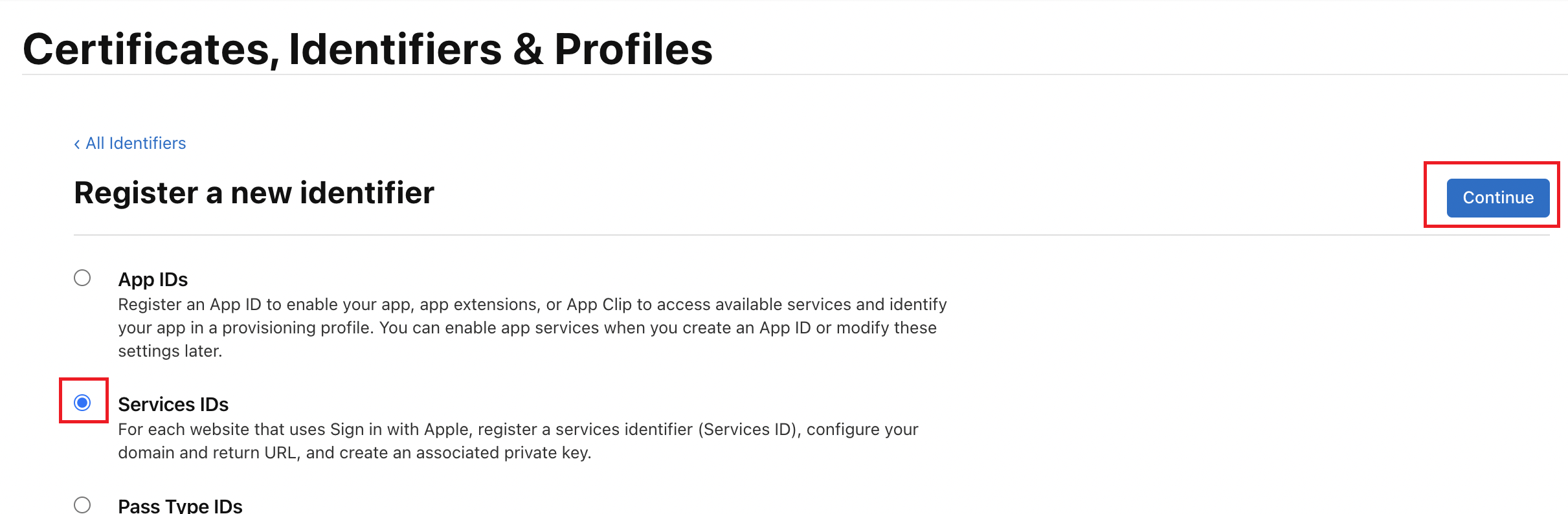 - Services IDs 를 체크 후 Continue