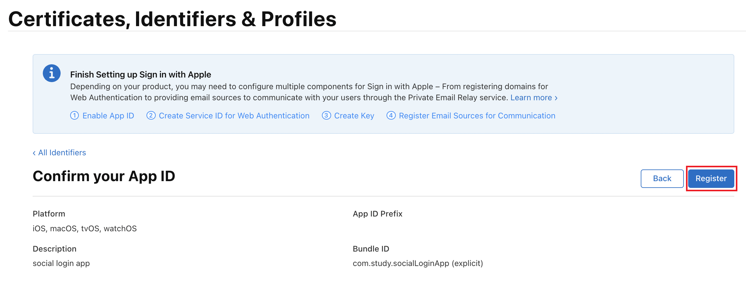 - Register 을 계속 눌러주면 App ID 설정이 완료 됩니다.