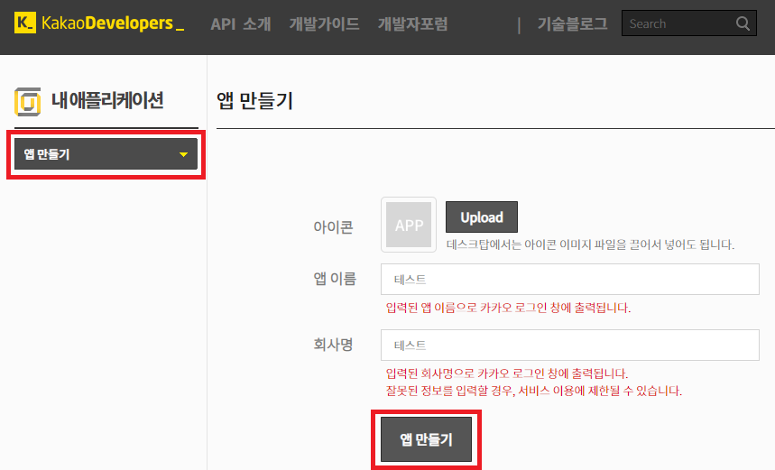 2. Kakao developer에 가입, 로그인 후 앱 만들기로 앱 생성